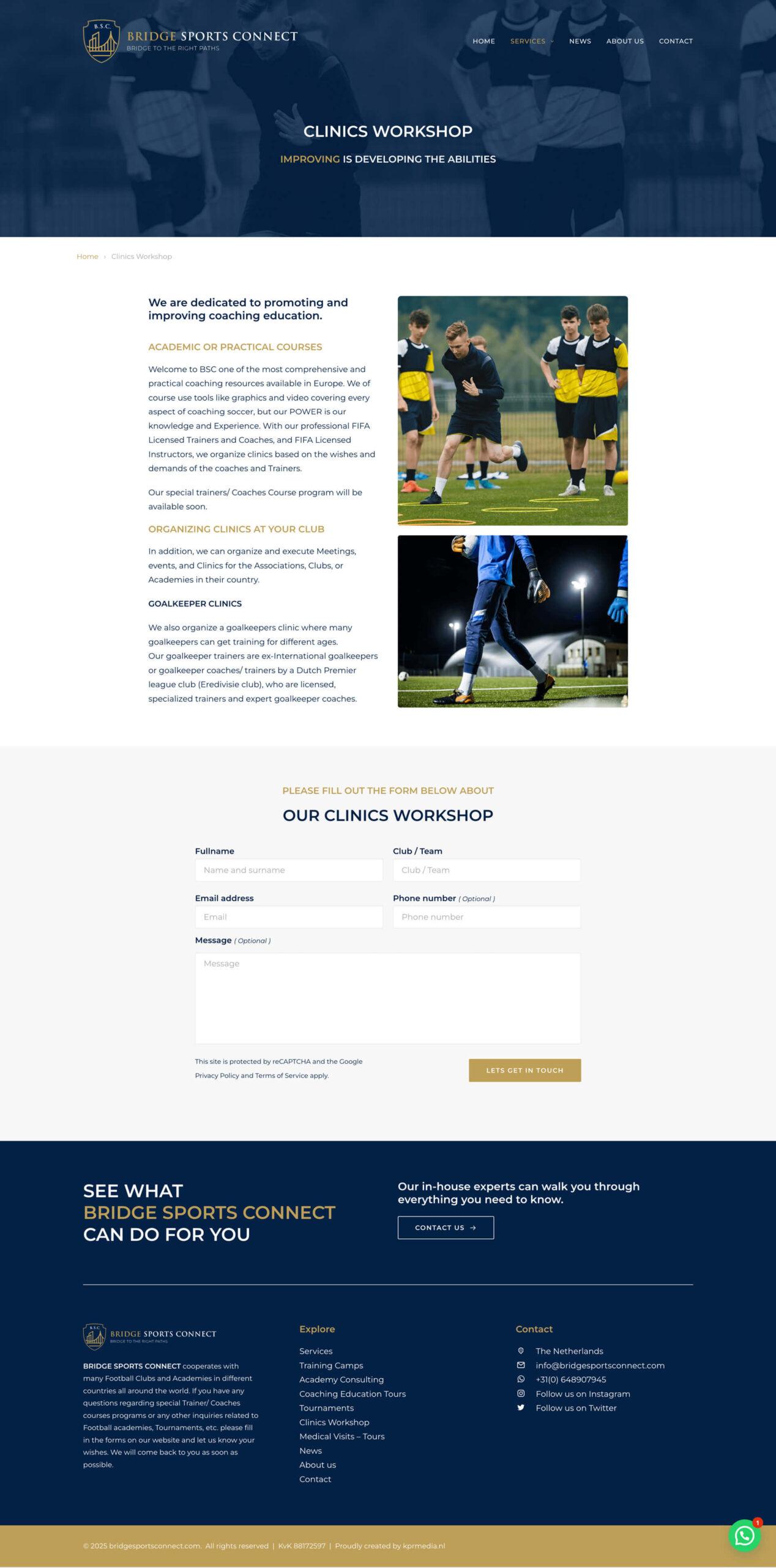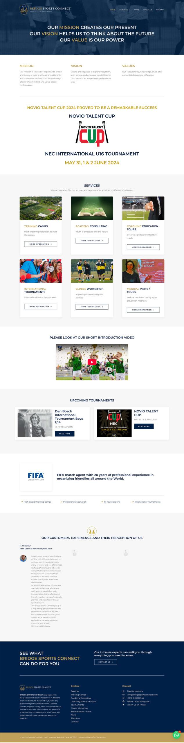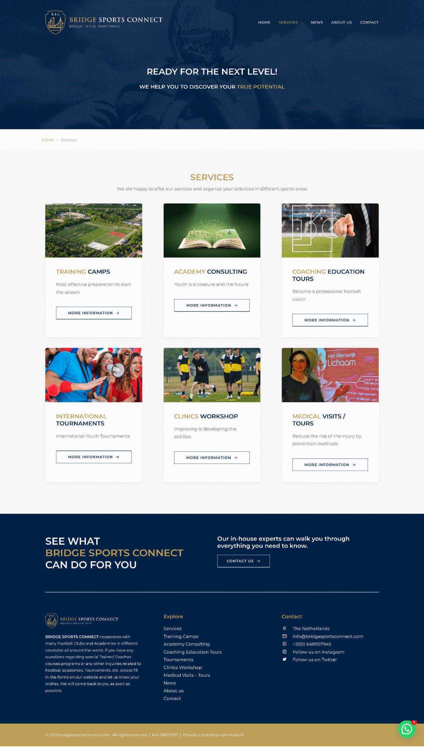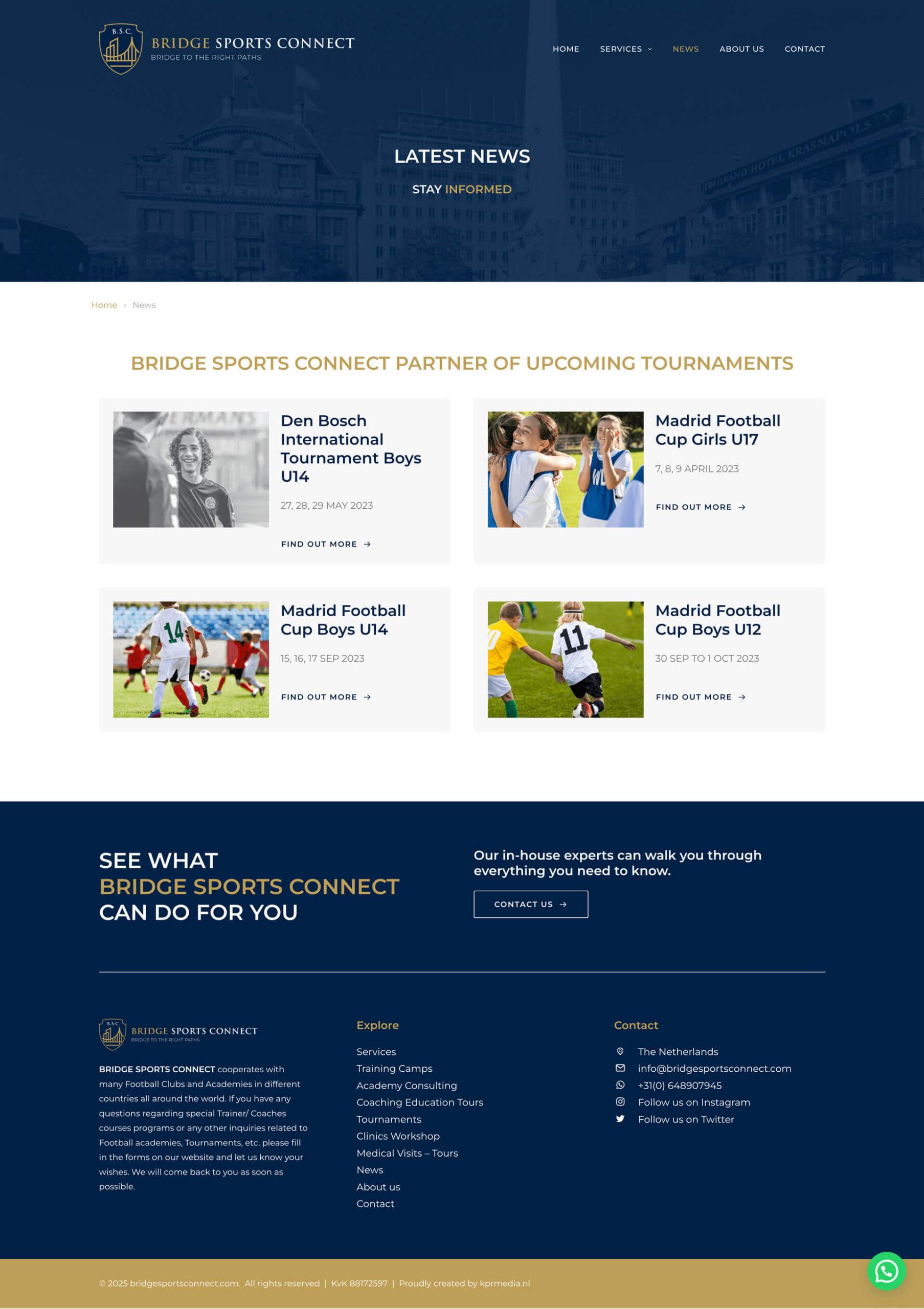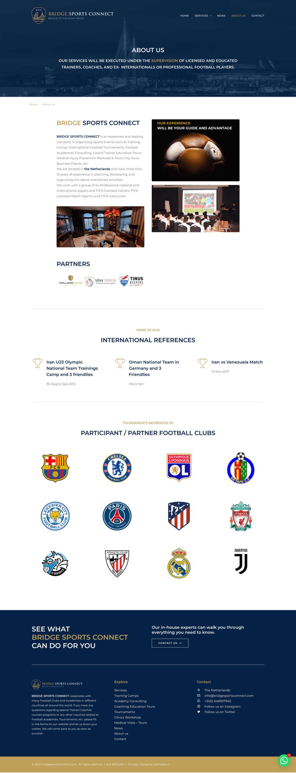Bridge Sports Connect is dé schakel tussen sportorganisaties, deelnemers en het publiek. Als toonaangevend organisator van sportevenementen, trainingskampen en van internationale toernooien tot coachreizen, academieadvies en blessurepreventie, brengt Bridge Sports Connect mensen samen door de kracht van sport.